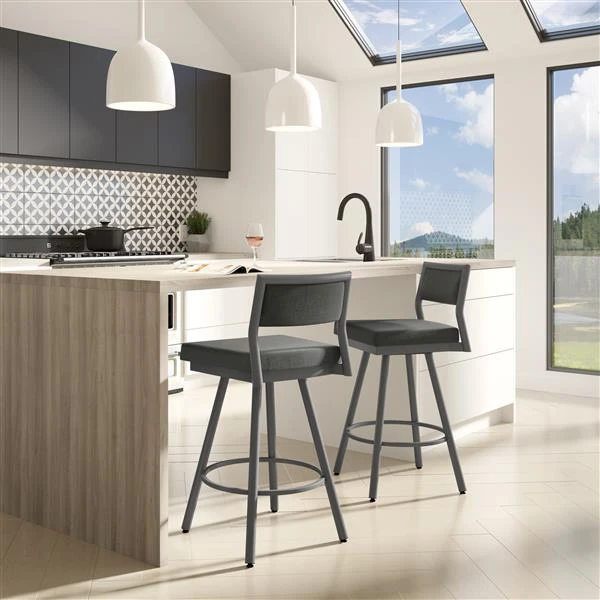 This swivel stool by Amisco® features a low backrest that provides just the right amount of comfort while pairing metal and upholstery adds style to your kitchen. Limited ten-year warranty. Assembly required.